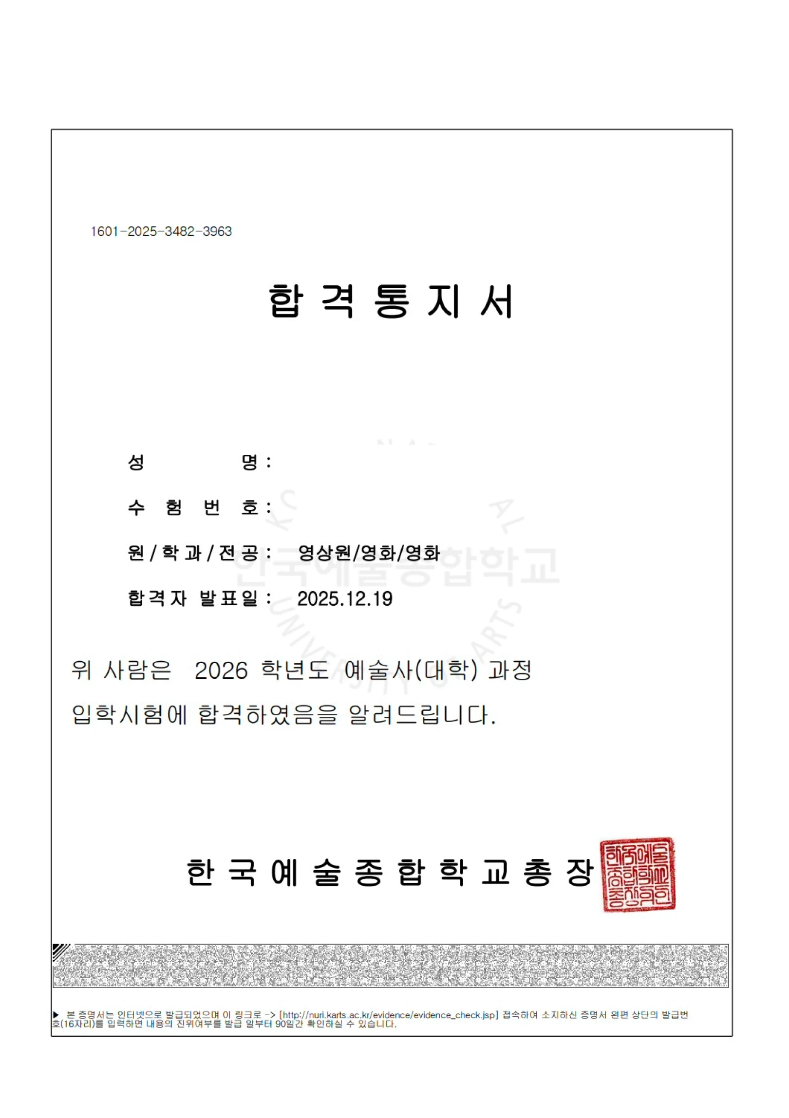 2026학년도 한국예술종합학교 예술사 영화과 합격생