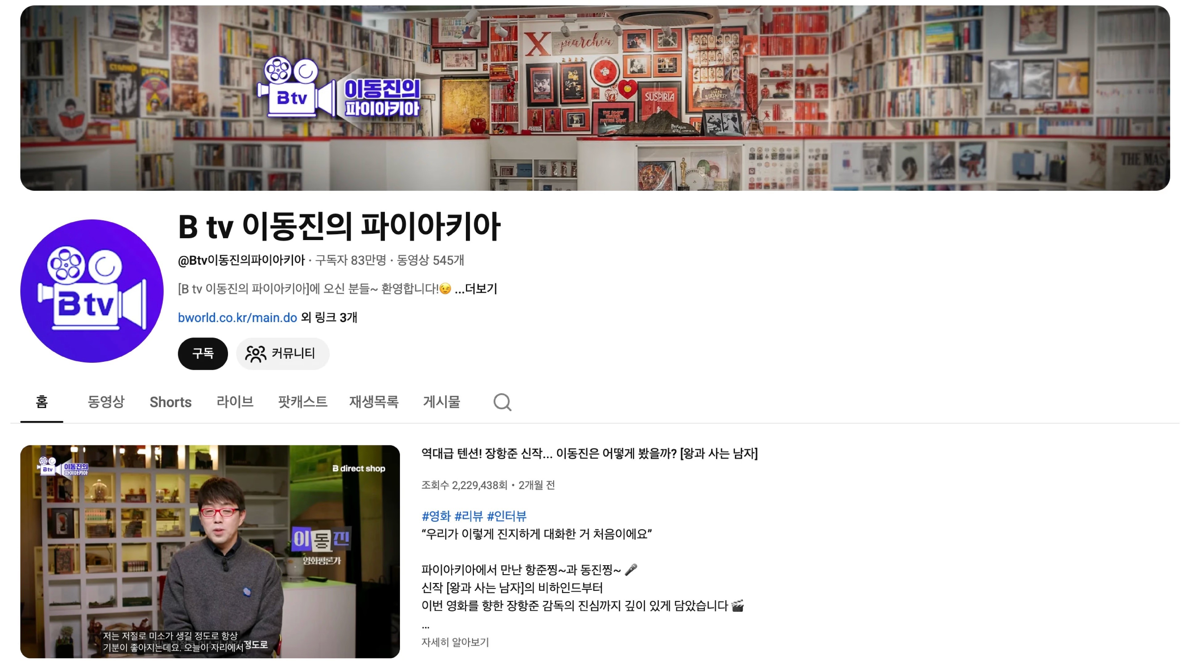 우리나라를 대표하는 영화평론가 이동진이 운영하는 채널입니다. 2020년 개설 이후 구독자 50만 명을 훌쩍 넘어섰고, 박찬욱·봉준호·송강호 같은 한국 영화계 거장들이 게스트로 출연하는 것으로도 유명하죠.