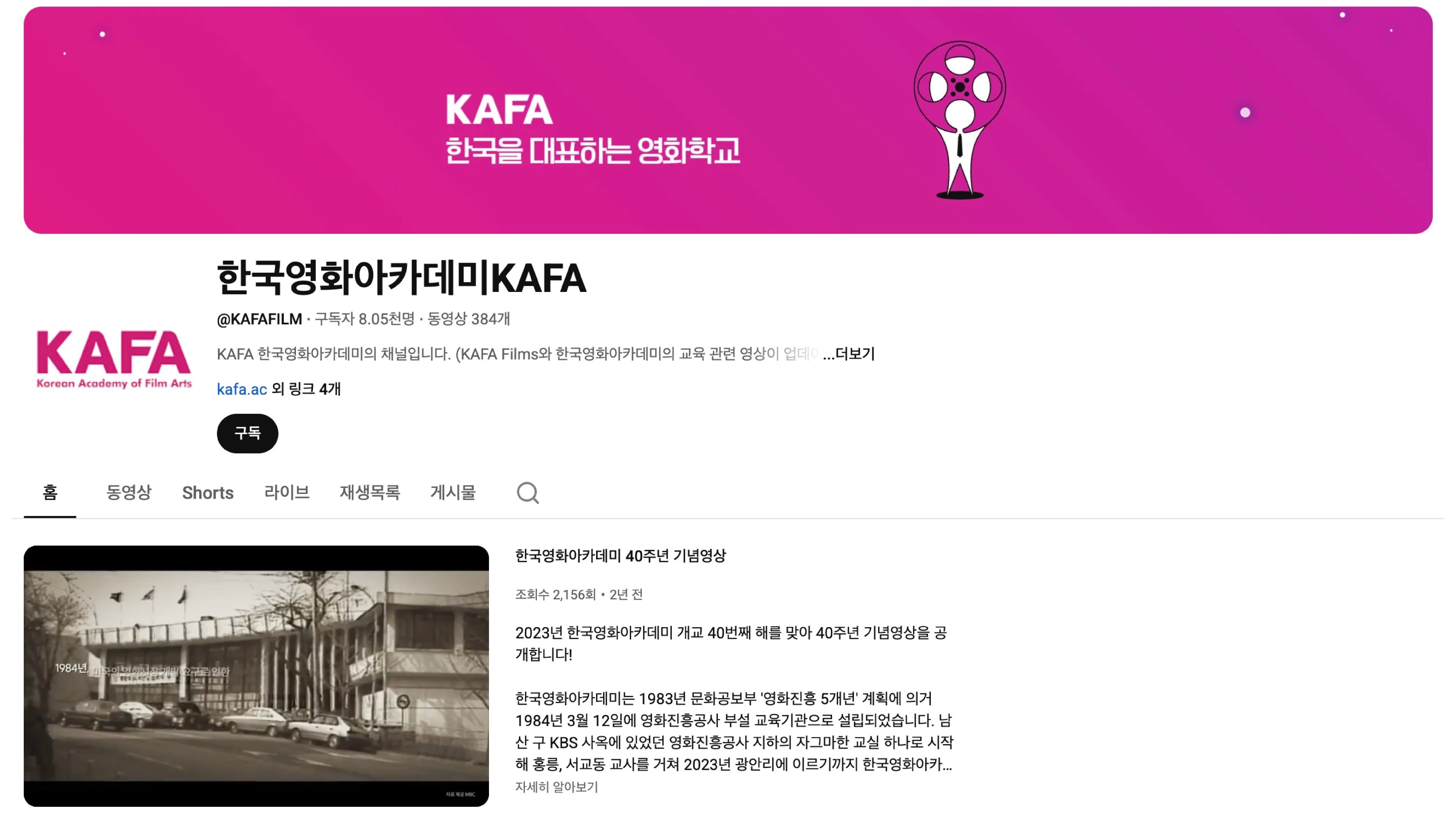 한국영화아카데미는 봉준호, 허진호, 김지운 감독 등 한국 영화계의 주요 인물들을 배출한 국내 최고 수준의 영화 전문 교육기관입니다. 공식 유튜브 채널에는 KAFA 소속 감독과 외부 초청 영화인의 강연·마스터클래스 영상이 올라옵니다.