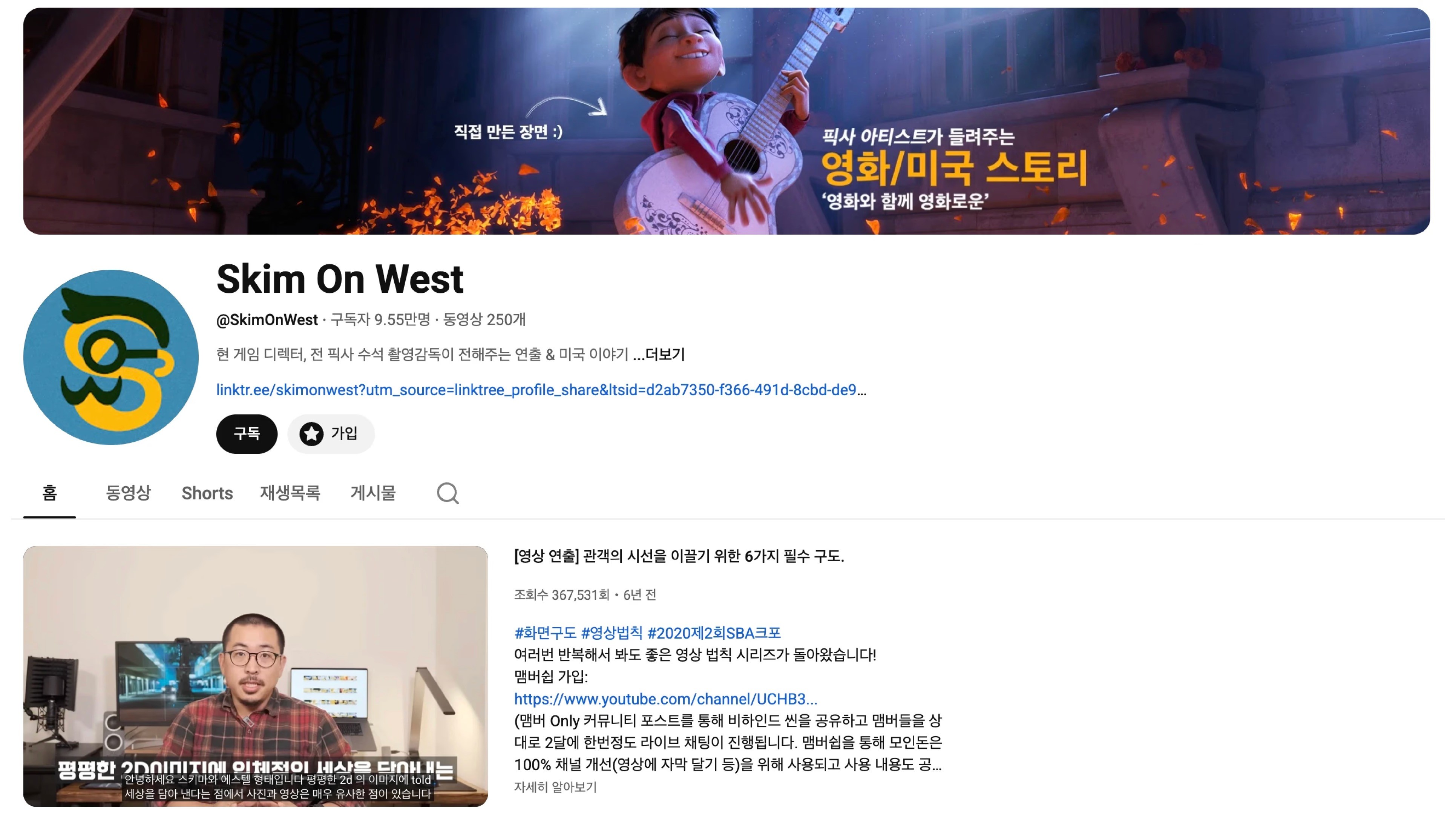 픽사에서 "코코", "소울", "인크레더블 2" 등의 레이아웃 아티스트로 참여한 션킴(Shaun Kim)이 운영하는 채널입니다. 이름 그대로 미국 서부에서 픽사 아티스트가 직접 전해주는 영상 연출 이야기가 핵심 콘텐츠예요.