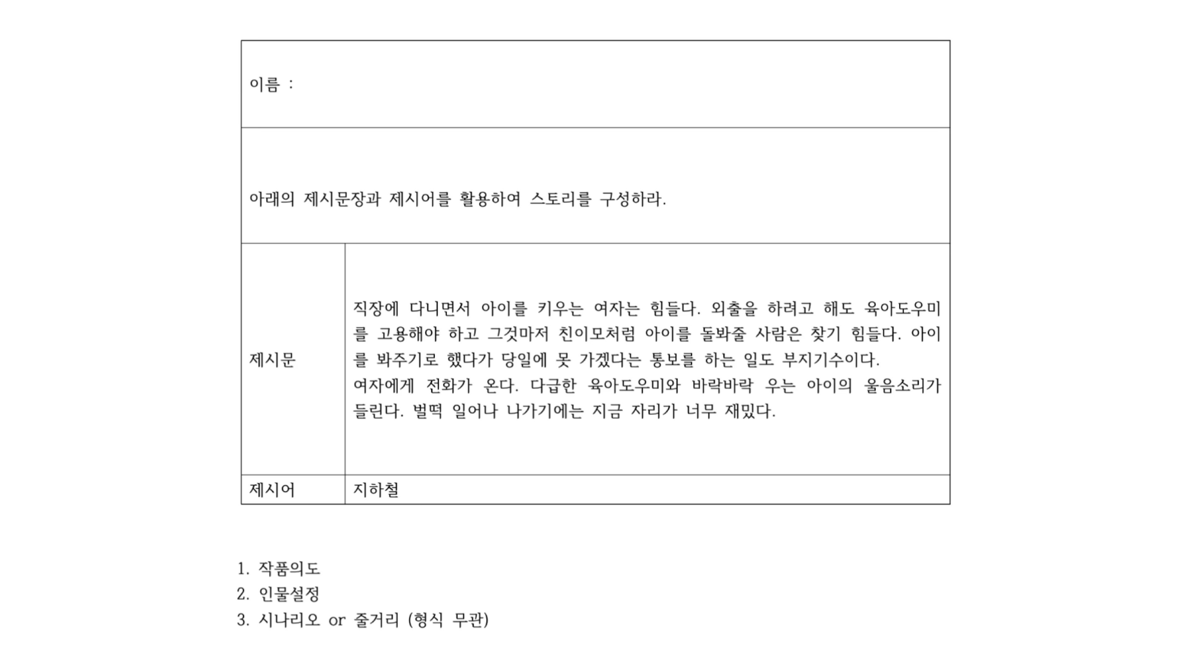 기출 사례를 보면, 직장에 다니면서 아이를 키우는 여자의 상황을 제시문으로 주고 "지하철"이라는 제시어를 함께 제공한 적이 있습니다. 일상적인 상황 속에서 갈등을 발견하고, 제시어를 스토리에 유기적으로 녹여내는 능력이 평가되는 거죠.