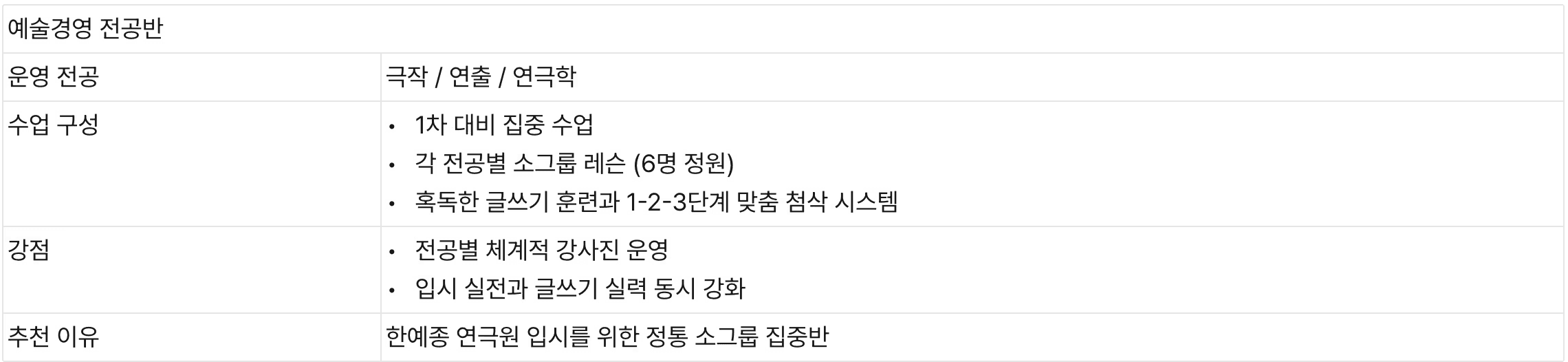 서울예대 예술경영 실기와 한예종 예술경영 워크숍 및 실기, 한예종 1차 언어능력 평가를 동시에 준비할 수 있는 국내 유일 커리큘럼