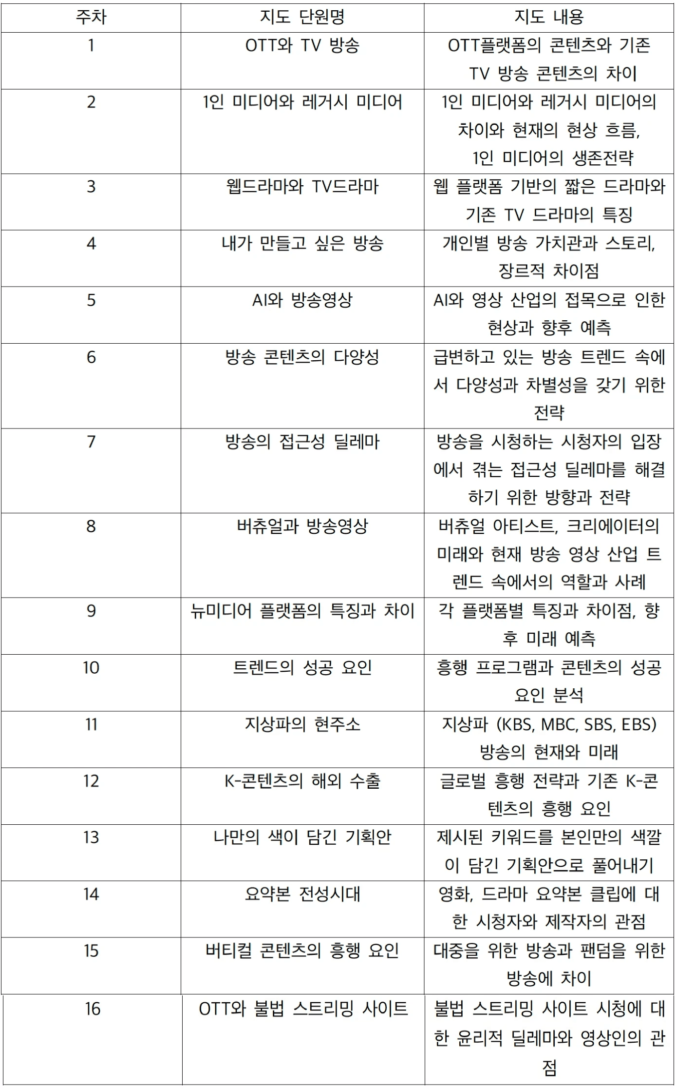 방송·영상 미디어 환경의 흐름과 구조를 이해하고, 트렌드를 자신의 관점으로 해석하는 비판적 사고력을 키웁니다.