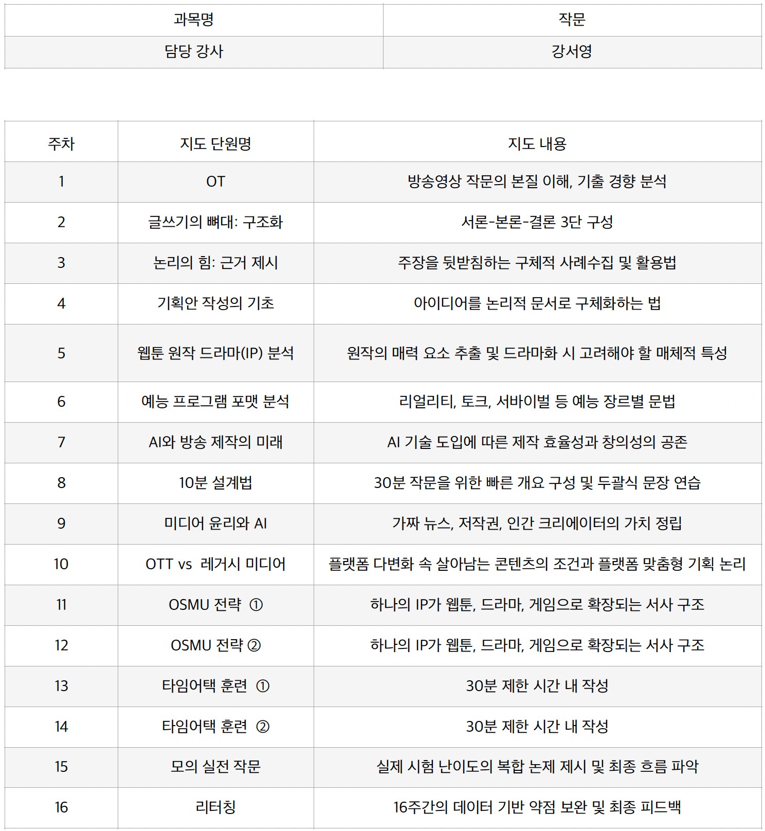 2026년 레포케 16주 커리큘럼 - 작문 과목