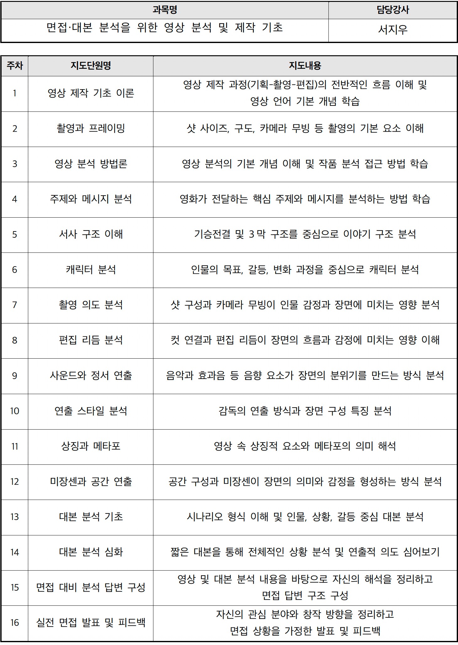 영화 및 영상 작품을 장면 단위로 분석하며 서사 구조, 연출 의도, 시청작 요소를 종합적으로 해석하는 능력을 기른다.