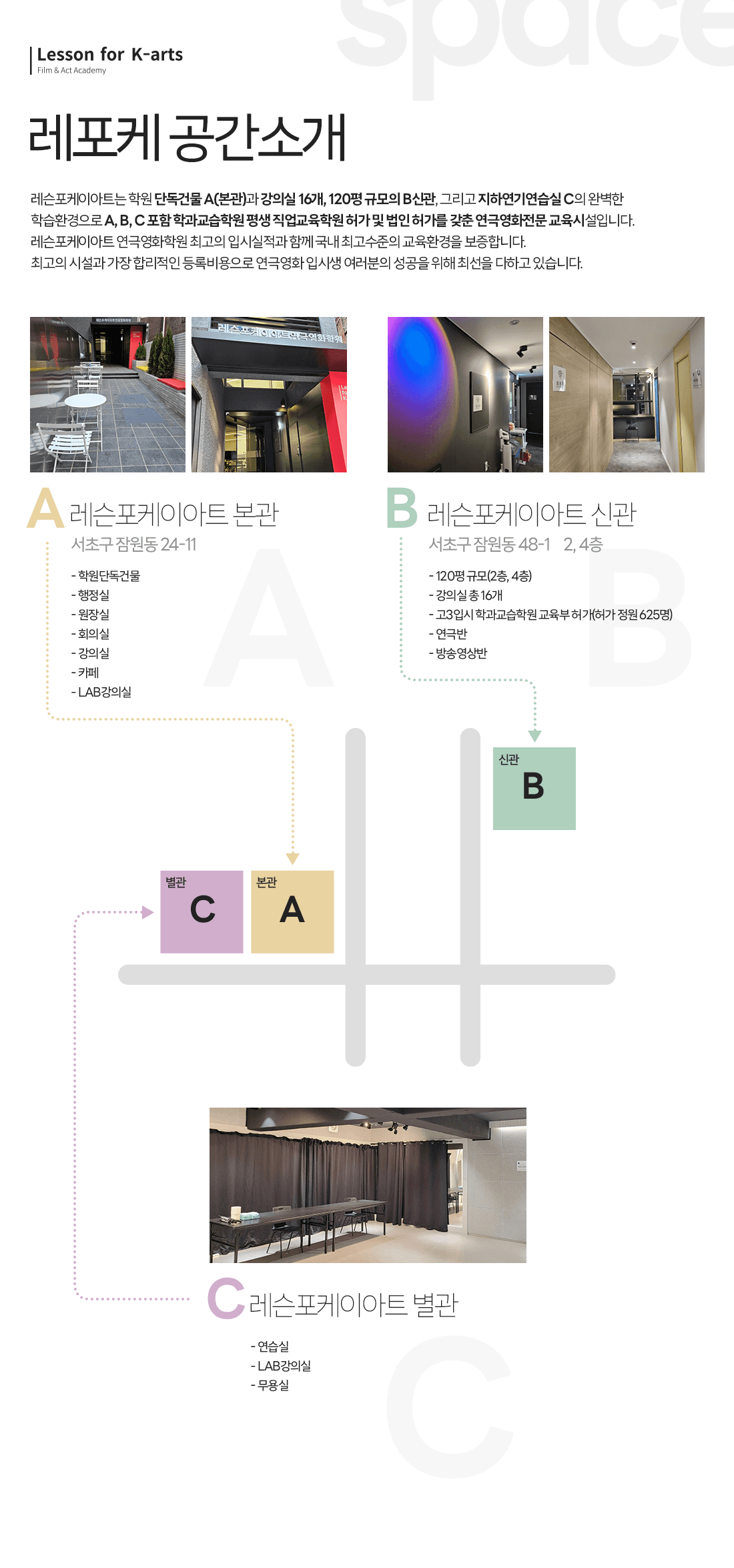 레슨포케이아트는 본관, 신관, 별관의 다양한 공간에서 수업을 진행하고 있습니다. 본관 (잠원동 24-11): 행정실, 강의실, 원장실, 카페 등 전용 공간 신관 (잠원동 48-1): 2층, 4층 총 16개 강의실 별관: 학생 실기 연습실로 사용 ※ 성인반은 한 달 45만원, 세 달 등록 시 39만원 온라인반: 한 달 40 / 세 달 등록 시 35 고3 주말반은 전공별로 다르며, 문의 시 안내드립니다.