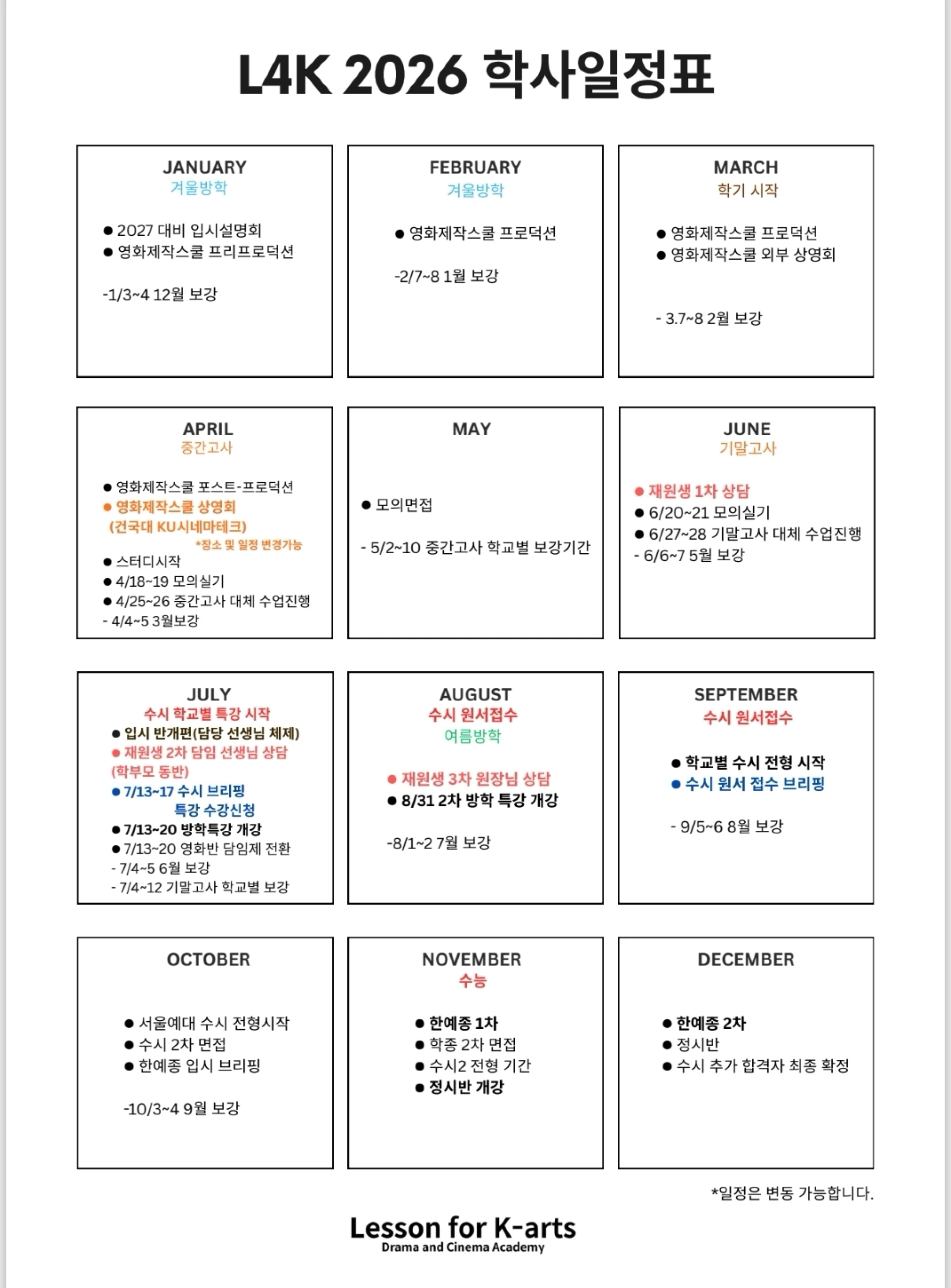 국내 No.1연극영화입시학원 레슨포케이아트연극영화학원은 2026년도 1년 학원의 학사운영과 커리큘럼을 미리 완성하고, 공개. 수강생들이 올해 어느 시점에 어떤 준비를 하게될지를 미리 대비하고 준비할 수 있게 합니다.