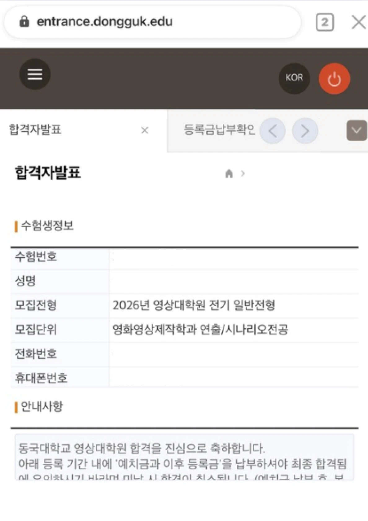 동국대학교 영상대학원 영화영상제작학과 연출시나리오전공 최종합격 , 포트폴리오 영화, 포트폴리오 시나리오, 자기소개서, 학업계획서 면접으로 구성된 시험입니다. 먼저 포트폴리오 영화, 포트폴리오 시나리오, 자기소개서, 학업계획서를 제출한 후 그걸 바탕으로 면접시험을 봅니다. 면접을 잘 보려면 ‘청산유수’로 말을 잘 하는 것이 중요한 것이 아니라 포트폴리오 영화, 포트폴리오 시나리오, 자기소개서, 학업계획서에서 보여지는 뚜렷한 열정과 도전이 증명되면 면접에서 자연스럽게 그 과정을 말씀드리고 합격할 수 있다고 생각합니다.