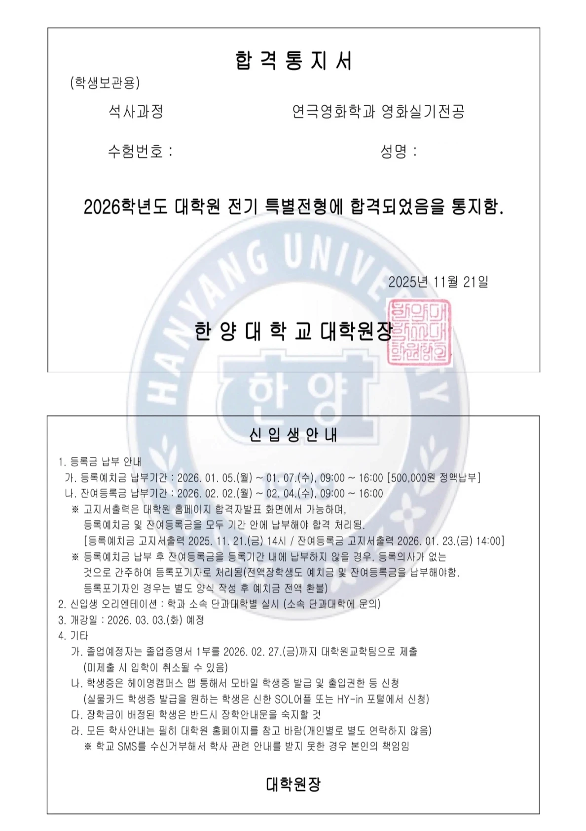 한양대학교 대학원 연극영화학과 영화실기전공 최종합격 , 포트폴리오 영화, 포트폴리오 시나리오, 자기소개서, 학업계획서 면접으로 구성된 시험입니다. 첫 번째로 본 면접이었고 긴장해서 면접을 망쳤었지만, 교수님께서 자기소개서와 학업계획서 포트폴리오에 대한 칭찬을 해주시고 짧은 면접시간안에 다 담지 못 했지만, 제출서류에 담긴 노력을 인정해 주셔서 합격할 수 있었다고 생각합니다.