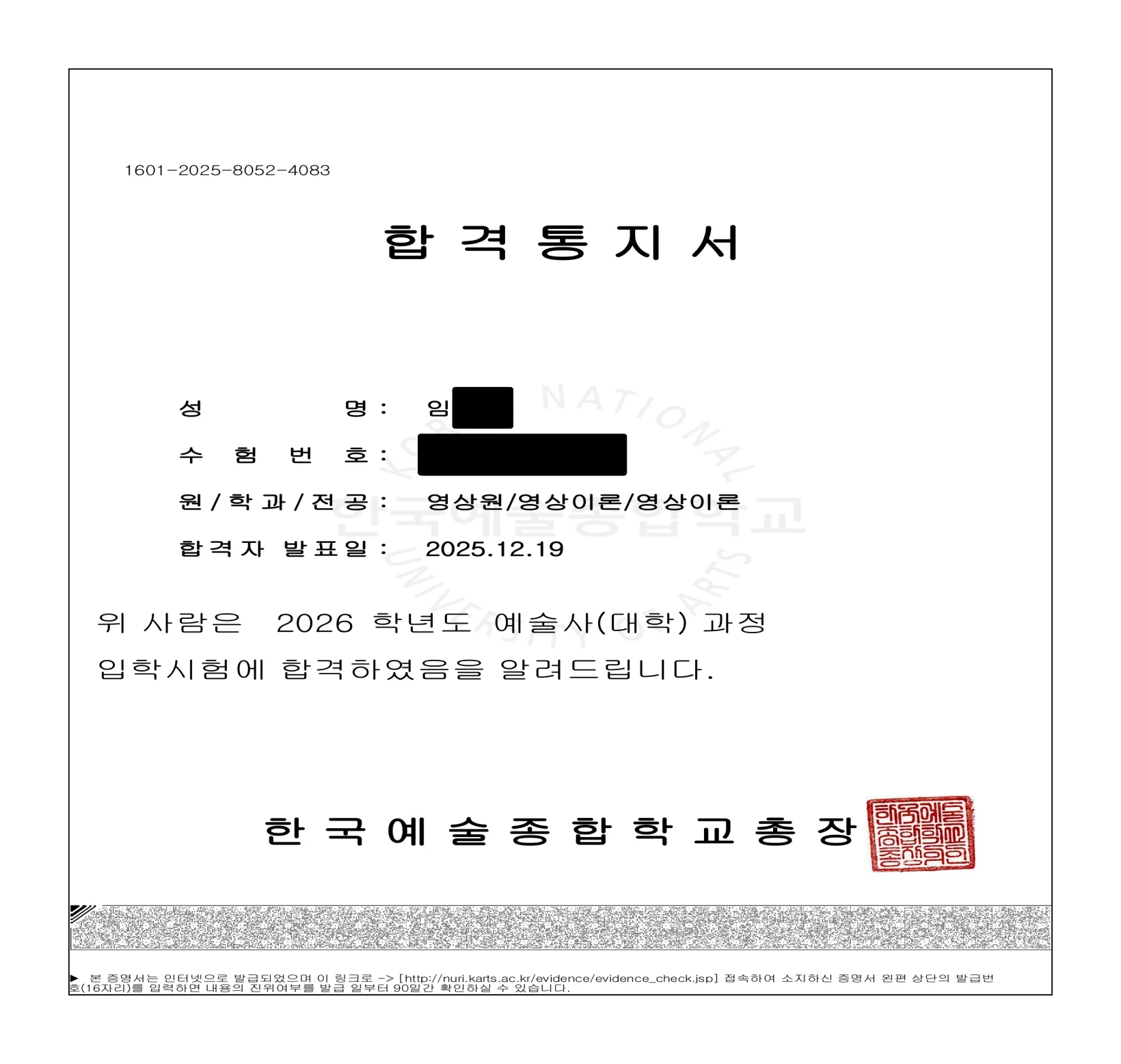 한국예술종합학교 영상이론과에 합격하였고 학교에서 치르는 자체 입학 시험 1,2차를 치르고 입학하였습니다.